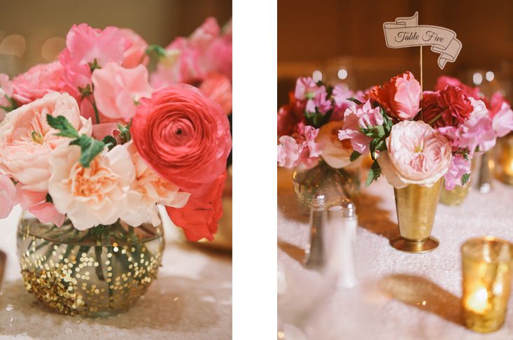 Ideja koje se nama dopada, a našom srećom i mladoj kojoj smo već radili dekoraciju po toj ideji, jeste kombinovanje različitih posudica u zlatnoj boji. Osim vazica, još puno toga može doći u obzir. Naš predlog su tegle i flašice neobičnog oblika u koje se postavljaju nekoliko cvetova ili buketići.